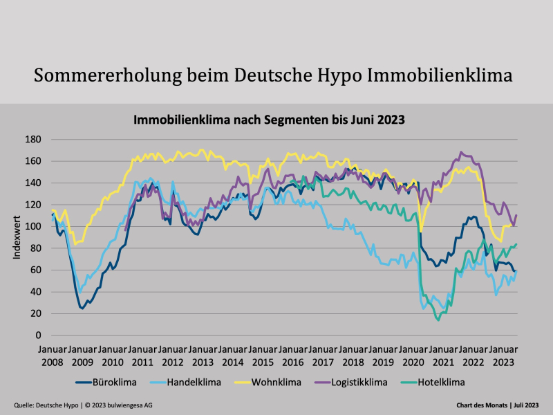 Das Deutsche Hypo Immobilienklima ist seit Anfang dieses Jahres volatil. Nach dem Rückschlag im Mai ist nun eine deutliche Erholung sichtbar. Lediglich in Bezug auf das Bürosegment sind die Befragten skeptisch – das liegt jetzt gleichauf mit Handel.