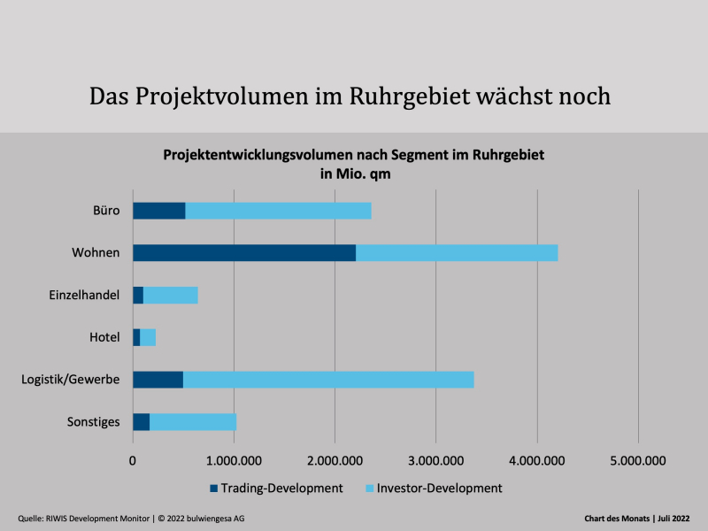 Die Projektentwicklerstudie Ruhr 2022 analysiert den Projektentwicklermarkt in allen kreisfreien Städten und Landkreisen des Ruhrgebiets. Dafür haben wir rund 2.000 einzelne Projekte ausgewertet. Laut der Studie summiert sich das gesamte Projektentwicklungsvolumen über alle Immobiliensegmente hinweg auf 11,8 Mio. qm. Damit ist das Ruhrgebiet vom Bauvolumen mit den A-Städten München und Hamburg vergleichbar. Rund die Hälfte des Volumens fällt auf die vier größten Städte: So werden in Bochum, Duisburg, Dortmund und Essen allein 69,6 % aller Büroflächen und 51,3 % aller Wohnflächen im Ruhrgebiet entwickelt. Getragen wird die positive Entwicklung von Wohn- und Büroentwicklungen, die seit 2020 einen Zuwachs verzeichnen.