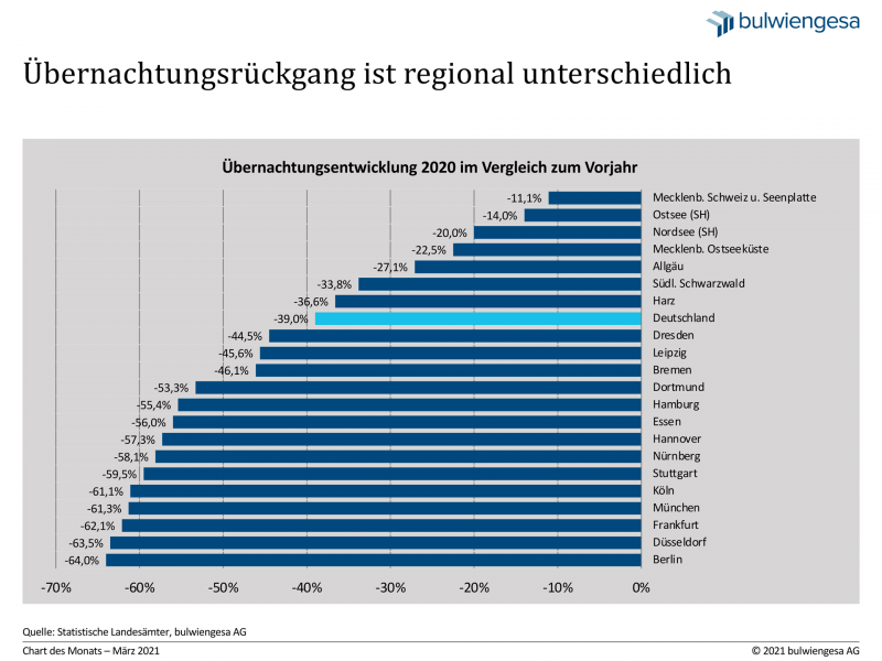 Deutsche Urlaubsregionen verzeichneten von Januar bis Dezember 2020 in Summe deutlich weniger Besucherrückgänge als die meisten deutschen Städte, da der erste Lockdown in einem für sie vergleichsweise noch günstigen Zeitraum kam und zu Beginn der Hauptsaison Reisen innerhalb Deutschlands wieder möglich waren.