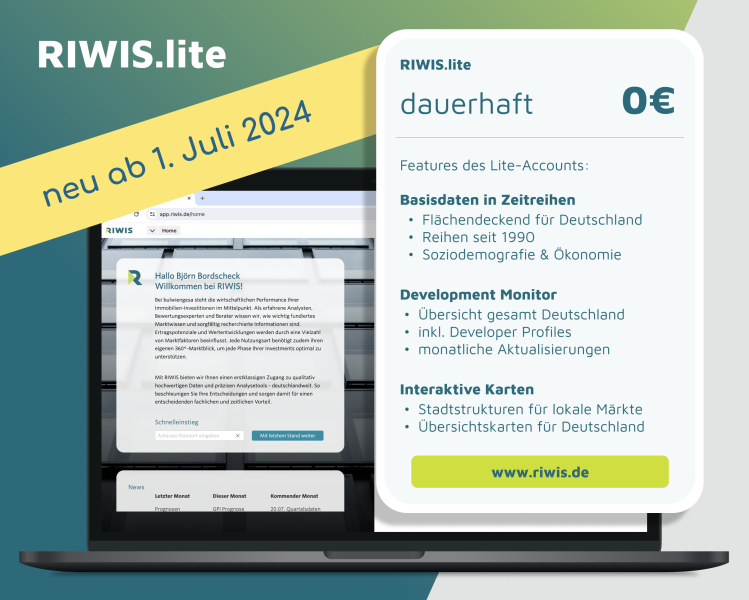 Wir freuen uns, Ihnen RIWIS Lite vorzustellen – die neue, kostenfreie und unbefristete Version von RIWIS. Im Gegensatz zu unserer bisherigen Testversion bietet RIWIS Lite jetzt eine umfassende Abdeckung für ganz Deutschland. Sie erhalten kostenlosen Zugang zu verschiedenen Funktionen, darunter zum Development Monitor Lite, zu allen soziodemografischen Daten, ausgewählten ökonomischen Kennzahlen und Stadtstrukturkarten.