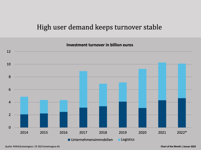 And this despite the yield adjustments caused by the general interest rate policy. The high user demand and the resulting cash flow security play an important role for many investors. For years there has been an enormous surplus demand, which is expected to continue in the near future due to more restrictive zoning. Macroeconomic trends, such as the return to re- and near-shoring in production, are causing additional demand pressure in the market. Also, meeting ESG criteria is becoming increasingly important. This means that demand is primarily focused on modern buildings that meet energy sustainability standards. These factors play a major role in the investor's security assessment and therefore once again result in a very strong performance on the transaction market in the completed year 2022.
