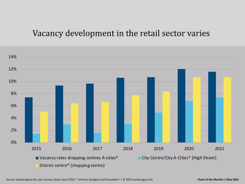 On the shopping centres: The data is based on the total of all shopping centres in the five A-cities surveyed. The range of qualities of the shopping centres is considerable. There are still shopping centres that operate with vacancy rates of no more than 5% of the retail space, while in others the upper floors often appear almost unrented, which leads to correspondingly high vacancy rates. It can also be seen that in the shopping centres - compared to the high streets - the vacancy rate is higher on average even in "good times". Recently, it has fallen again minimally in the selected cities.