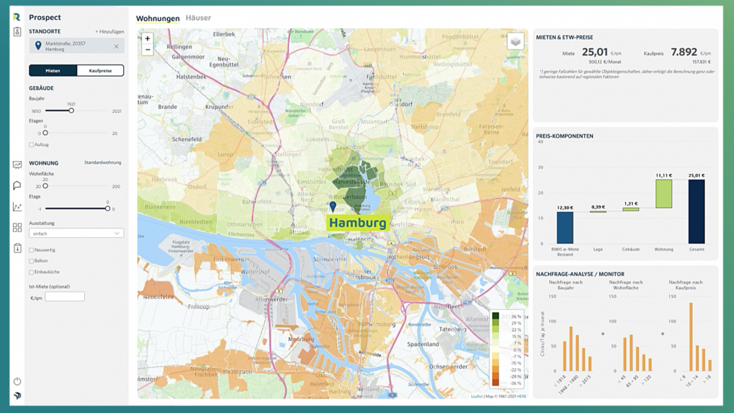 RIWIS Prospect is used by our clients to very simply determine the earnings potential for flats. The pricing model is based on data from property portals and additional market and location information from our RIWIS database. In addition to countless individual values, we have now also issued prices for portfolios with more than 20,000 residential units.