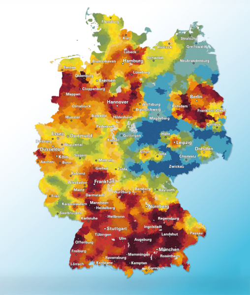 Ausgehend von den Großstädten verschiebt sich angesichts eines geringen Angebots und einem gleichzeitig hohen Bedarf die Nachfrage immer weiter in das Umland, wodurch sich ehemals kühlere Bereiche stärker aufheizen und die Temperaturunterschiede langsam verschwimmen. In den vergangenen Wohnwetterkarten war beispielsweise der Rhein-Neckar-Raum um die Städte Mannheim, Ludwigshafen und Heidelberg in einer vergleichsweise komfortablen Lage. Die hohe Wirtschaftskraft und die ordentlichen Fertigstellungszahlen sorgten außerhalb weniger Top-Lagen für einen auch preislich moderaten Wohnungsmarkt. Dies hat sich nun auch hier verändert, sodass weitere Entlastungsstandorte in der Region gefragt sind. In Bayern gilt ähnliches für den Raum Würzburg, in Oberschwaben für Ravensburg.