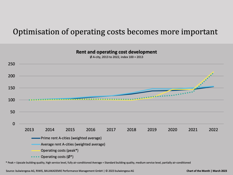 The main cost drivers are heating and electricity, triggered by the war in Ukraine and the resulting realignment of energy prices on the world market. The extent to which these cost increases will affect operating costs depends on the prices and terms at which landlords have concluded their energy supply contracts and the effect of the electricity and gas price brakes. In addition, wage costs have risen successively, which have a significant impact on all personnel-intensive services such as maintenance/inspection, cleaning, security and caretaking. The increase in the minimum wage on 1.10.2022 will only have been a foretaste, given the current wage demands of the trade unions to achieve a real wage increase for all employees in the sector. Only the costs for water and sewage have decreased in view of the decline in office occupancy due to the increasing importance of remote work.