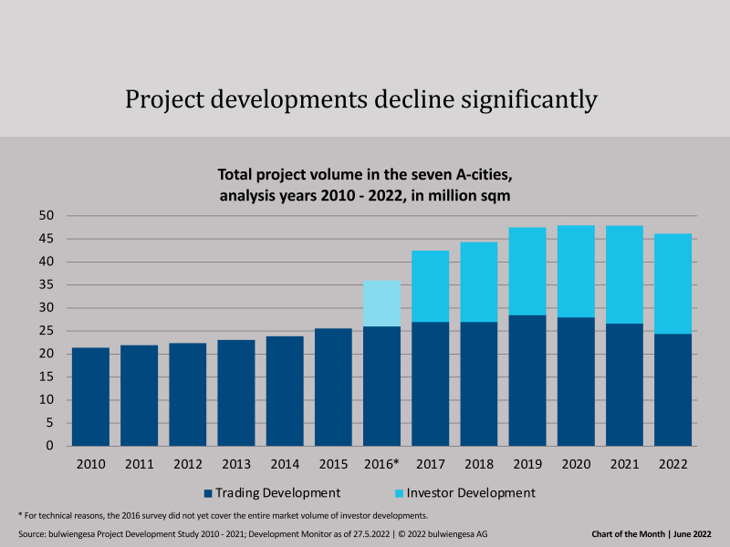In the seven class A cities of Berlin, Hamburg, Cologne, Düsseldorf, Stuttgart, Frankfurt and Munich, the trading development volume alone fell across all segments to 24.4 million sqm. Compared to the peak value of 2019, when 28.5 million sqm were still under development, this even corresponds to a decline of over 14 %. The market for trading developments continues to be dominated by residential project space - followed by offices and retail space - and primarily by project developers operating nationwide.