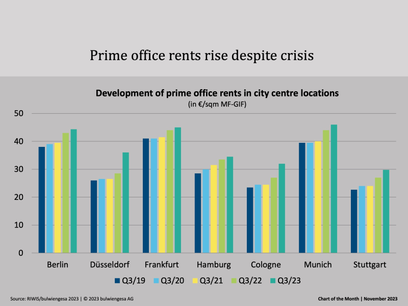 Office vacancies are increasing in the seven class A cities. According to classic economic theory, rents should therefore be falling. But our quarterly figures show: Prime rents are still rising.