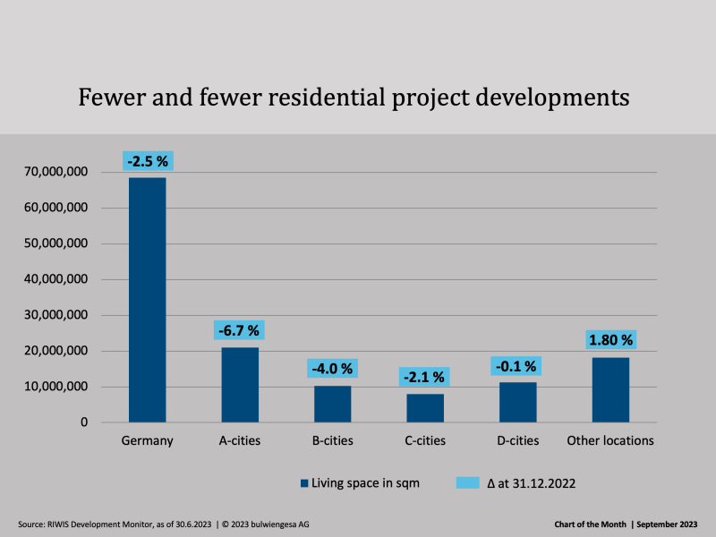 We have been monitoring the market for project developments for many years. For a current analysis, projects completed since 2020 as well as projects under construction and in planning with a realisation horizon of 2027 from a size of 1,500 sqm of residential or rental space were evaluated and the changes as of 30.6.23 compared to 31.12.22 were documented.